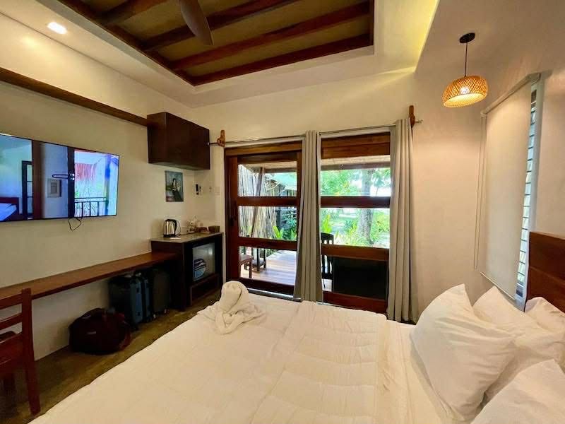 A spacious tropical cottage just steps from the beach. It usually includes a porch overlooking the ocean or garden, with amenities like air-conditioning, refrigerator, and a private bathroom with hot shower. This room is ideal for couples or small groups who want a relaxing beachfront stay while enjoying the peaceful island atmosphere of Siargao.